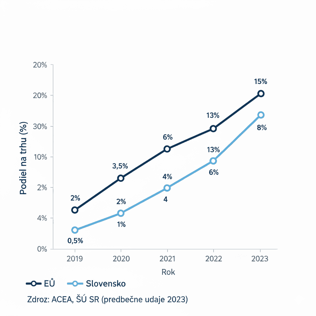 - Slovensko: absolútne čísla sú stále nízke, ale flotila BEV rastie medziročne o desiatky percent a väčšina je registrovaná na firmy.